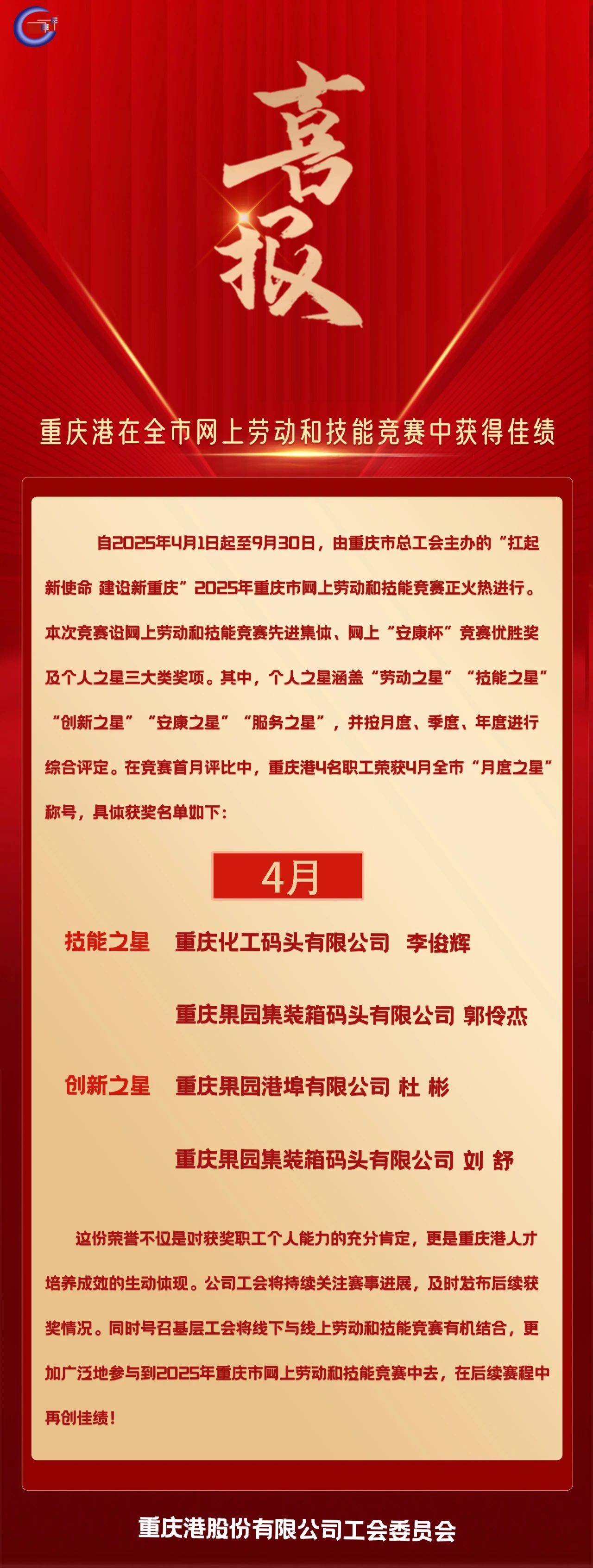 喜报!重庆港在全市4月网上劳动和技能竞赛中获得佳绩